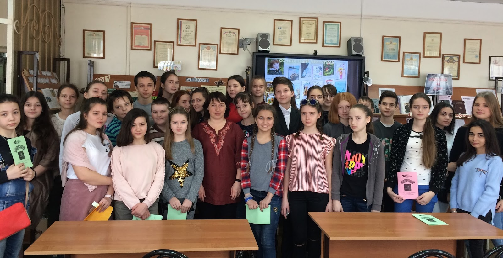 В конце встречи все ученики захотели взять автограф у писательницы. Кто-то приобрел книгу и получил автограф, а кто-то попросил оставить его на буклете, который мы подготовили.